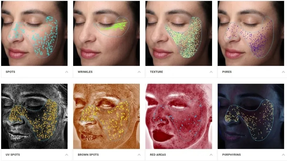 - Redness, vascular visibility, and pore mapping
