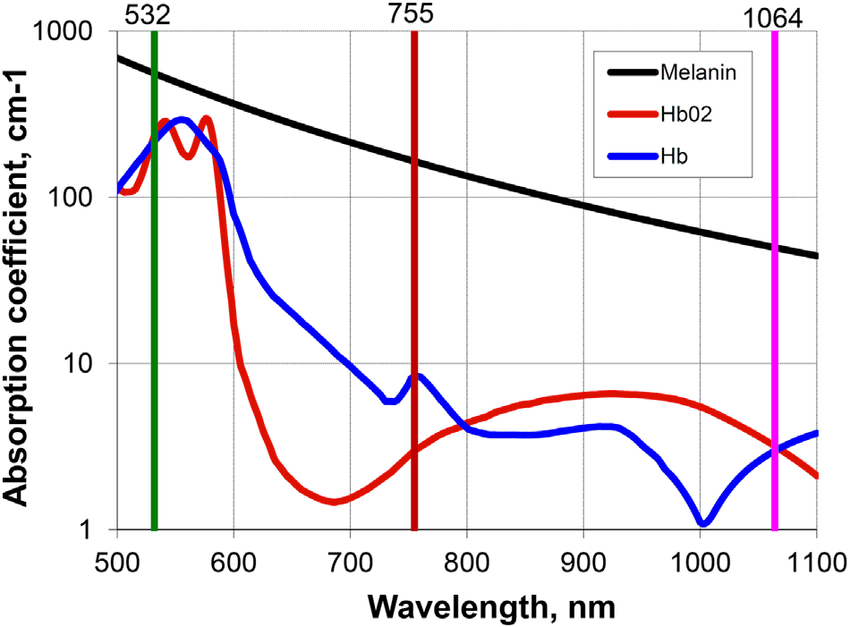 - 532 nm – Surface pigment like freckles and sunspots.