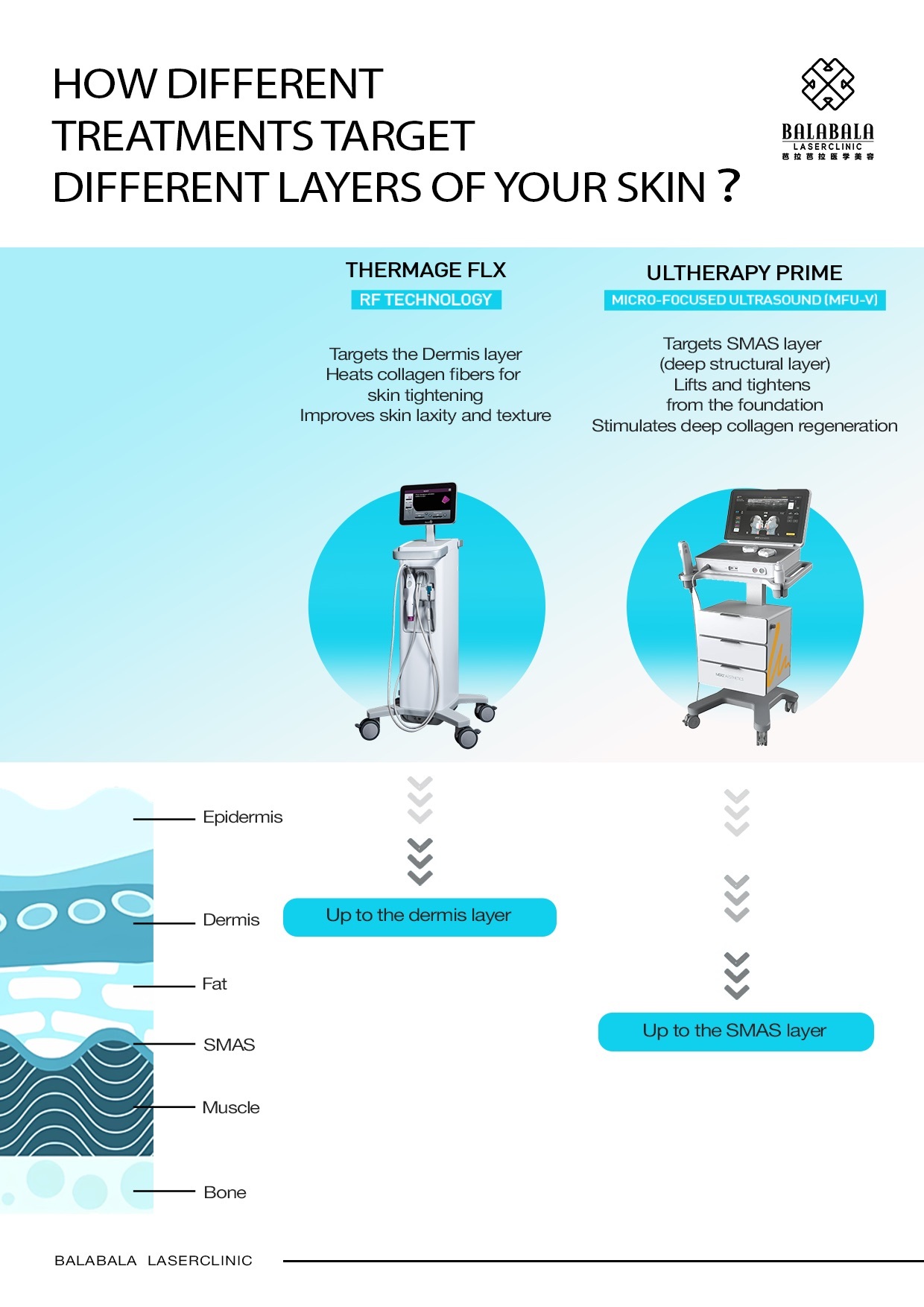 At BalaBala Laser Clinic in Adelaide, our practitioners often sequence treatments by depth. We might recommend Ultherapy Prime first to reposition and lift deeper structures, followed by Thermage FLX several months later to refine surface firmness and skin texture.